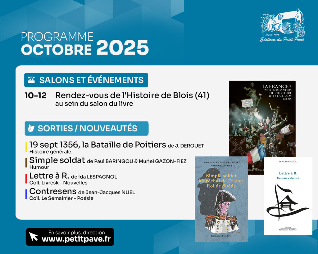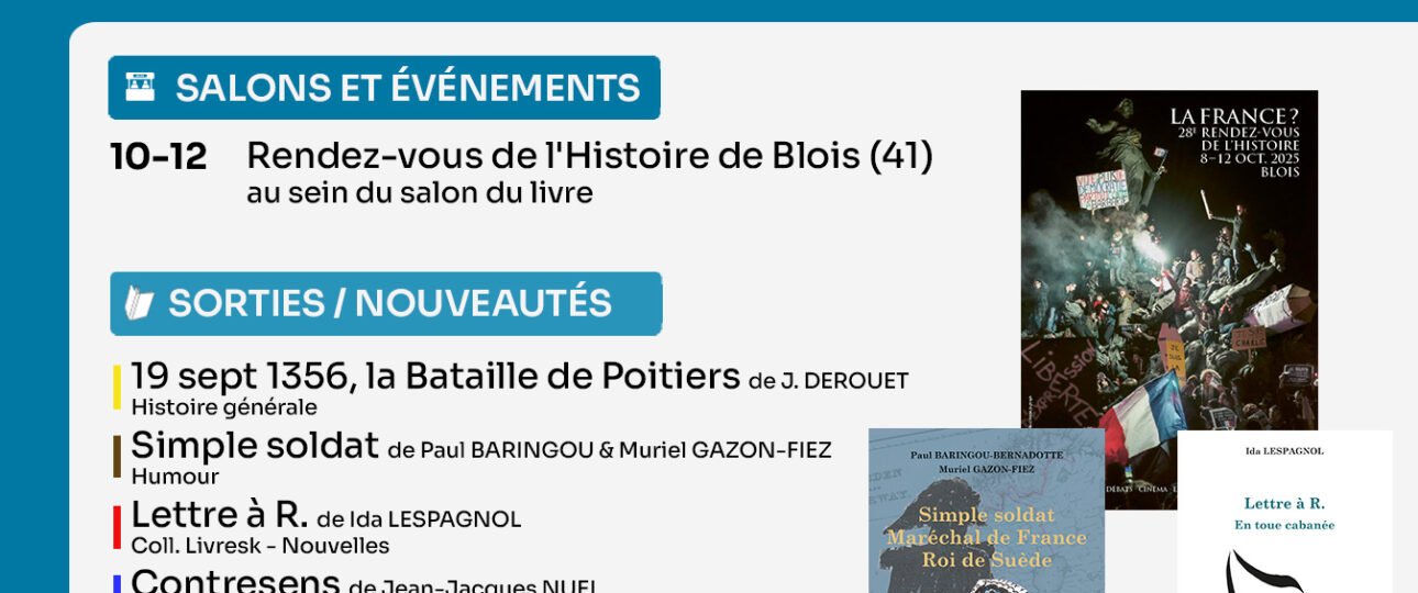 Pas beaucoup de dates sont à retenir ce mois-ci, avant le salon de L’Autre Livre le mois prochain. Une seule même est à noter : le week-end du 10-11-12 octobre 2025, où nous aurons le plaisir de vous retrouver dans le Loir-et-Cher ! En effet, de nouveau, nous aurons un stand aux Rendez-vous de l’Histoire de Blois, avec des nouveautés sur nos tables.