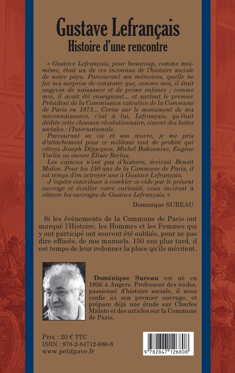 Le Petit Pavé a choisi de rendre hommage à Gustave Lefrançais, Premier Président de la Commune de Paris. Combattant sur les barricades pendant la semaine sanglante. Réfugié à Genève et condamné à mort par contumace. Eugène Pottier, l’auteur de l’Internationale, lui dédiera cet hymne.