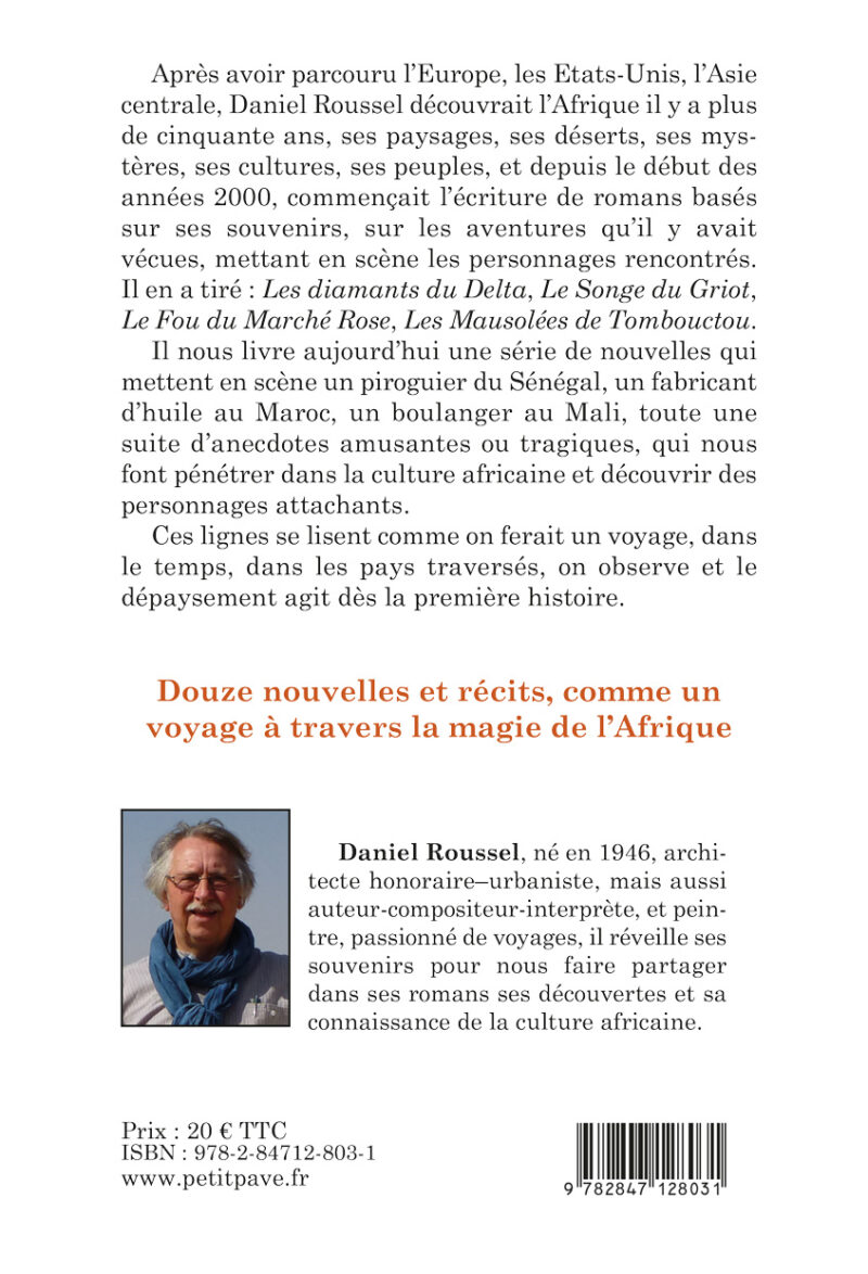 Après avoir parcouru l’Europe, les Etats-Unis, l’Asie centrale, Daniel Roussel découvrait l’Afrique il y a plus de cinquante ans, ses paysages, ses déserts, ses mystères, ses cultures, ses peuples, et depuis le début des années 2000, commençait l’écriture de romans basés sur ses souvenirs, sur les aventures qu’il y avait vécues, mettant en scène les personnages rencontrés. Il en a tiré : Les diamants du Delta, Le Songe du Griot, Le Fou du Marché Rose, Les Mausolées de Tombouctou. Il nous livre aujourd’hui une série de nouvelles qui mettent en scène un piroguier du Sénégal, un fabricant d’huile au Maroc, un boulanger au Mali, toute une suite d’anecdotes amusantes ou tragiques, qui nous font pénétrer dans la culture africaine et découvrir des personnages attachants. Ces lignes se lisent comme on ferait un voyage, dans le temps, dans les pays traversés, on observe et le dépaysement agit dès la première histoire.